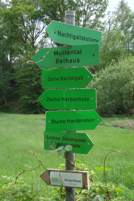 Zuerst folgt man, vom Parkplatz aus, dem Schild in Richtung Schloss Steinhausen. Gleich zu Beginn steigt der Weg an. Dann teilt er sich, man wandert ein kurzes Stück nach rechts und biegt vor der Einfahrt zu Schloss Steinhausen nach links. Auf dem asphaltierten Wirtschaftsweg überwindet man eine kleine Anhöhe und neben Hausnummer 50 wandert man geradeaus. An der folgenden Einmündung geht es halb rechts weiter. An der nächsten Möglichkeit links in die Straße „Auf der Marta“. Vor dem Privatweg geht es nun rechts auf einem schmalen Pfad einen Bach entlang. Der Weg scheint vor einem Tor zu enden. Man kann aber an diesem vorbei weiter wandern. Ohne das man abbiegen muss bringt einen der Weg bis zur Burgruine Hardenstein. Vor dieser biegt man nach links ab. An der Wegeeinmündung weiter in Laufrichtung. Vorbei am Stollen Reiger gelangt man zu einem kleinen Platz im Wald und biegt dort nach rechts ab. Es folgt eine Spitzkehre und es geht weiterhin bergauf. Hinter dem rot-weißen Tor geht weiter geradeaus. Am Waldrand erreicht man schöne Fachwerkhäuser und wandert weiter in Laufrichtung. Auch im Wohngebiet hält man die Richtung bei, bis man in die Straße „Am Herrenbusch“ links einbiegt. Gleich darauf geht es linker Hand in den Wald. An der folgenden Wegeteilung rechts und bergauf. Der Weg windet sich nun durch den Wald und erreicht auf einer Lichtung eine Kreuzung. Hier folgt man dem Weg in einem Links-Rechts-Knick und dann weiter in Laufrichtung. Der Weg mündet auf Asphalt und biegt halb links, an einem Parkplatz vorbei, ab. An der T-Kreuzung links ab und der Kreisstraße 4 folgen. An der nächsten Möglichkeit abermals links abbiegen in die „Berghauser Straße“. Hinter dem Restaurant „Zur alten Tür“ geht es nach rechts bergauf. Am Feuerwehrturm vorbei führt der Weg in Richtung Muttental wieder in den Wald hinein. Hinter dem Göpelschacht Moses geht es weiter geradeaus. Hinter der nächsten Wegebiegung führt der Weg bergab und an der folgenden Kreuzung gleich wieder nach rechts. An der nächsten Kreuzung geht es auf dem zweiten (unteren) Weg wieder nach rechts. Hinter einem Flözaufschluss geht es weiter bergab. Man überquert einen kleinen Bachlauf und biegt daraufhin nach links. An einer weiteren Gabelung geht es rechts bergauf. Der Weg schlängelt sich einen waldigen Hügel hinauf um in der nähe eines Gestüts links abzubiegen. An der Reitschule vorbei geht es nun weiter auf Asphalt. Vorbei an Hausnummer 41 schwenkt der Weg nach rechts, um gleich darauf wieder nach links zu biegen. Man bleibt weiterhin auf Asphalt. Am „Platanenweg“ links und weiter bergab wandern. Man befindet sich auf der „Frielinghauser Straße“ und wandert diese hinunter, bis sie einer Spitzkehre mündet. Nun links herum zum Ausgangspunkt der Wanderung. Die GPX-Daten waren auf dieser Wanderung so schlecht das Ich den Link zum Download entfernt habe.