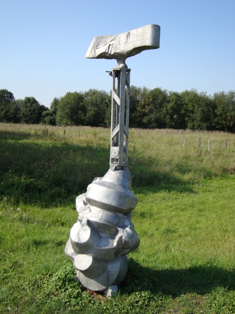 Durch die kleine Ortschaft geht es schnell in die angrenzenden Felder. Aus der Ferne hört man das beständige Klacken der Fahrzeuge die über die Dehnungsfuge A44-Rheinbrücke fahren. Der Belag wechselt von Asphalt auf Schotter und der Weg führt durch ein kleines Wäldchen immer näher an den Rhein heran. An der Skulptur auf dem Foto biegt man nach links und folgt für kurze Zeit dem Rheindamm. Dahinter hört man das tuckern der Schiffsdiesel. Ohne Abstecher auf den Damm wird man allerdings kein Wasser auf dieser Wanderroute sehen. Zurück am Ortsrand geht es links in einen kleinen Pfad, der auf der Rückseite der Häuser entlang führt. Hin und wieder kann man einen Blick in die meist gepflegten Gärten werfen. Ein letztes mal rechts abbiegen und entlang der Straße “An der alten Schule” geht es zurück zum Parkplatz.